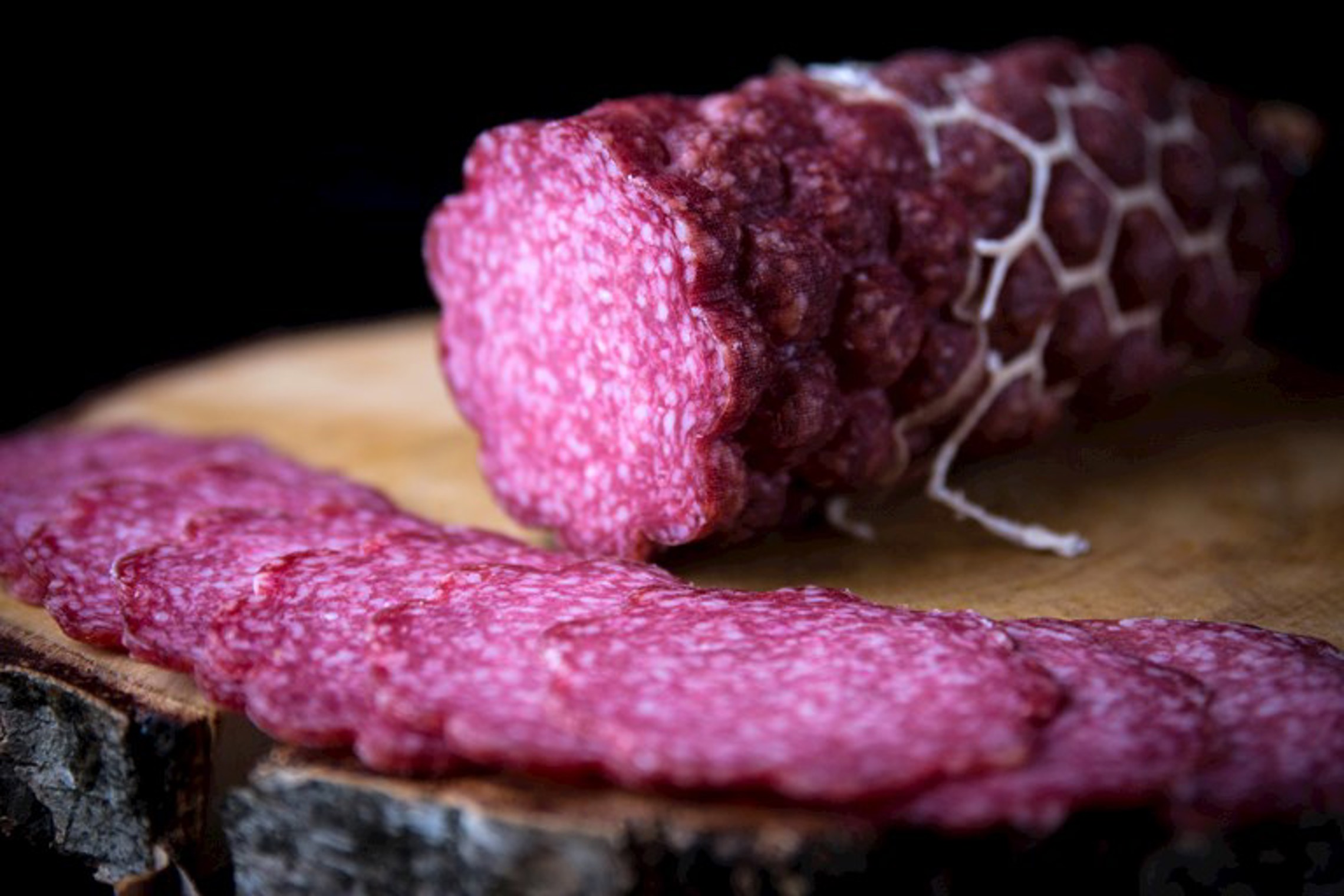 De zachtste salamisoort op deze planeet. Uiterst mager kalkoenvlees fijn gecutterd met het beste spek en op smaak gebracht met een fris kruidenarsenaal. De speciale darm geeft het mooie effect dat deze worst verdient. Een huzarenstukje van onze salamimeester. Deze worst is zo goed dat alle beschrijvingen tekort schieten. Gewoon proeven!