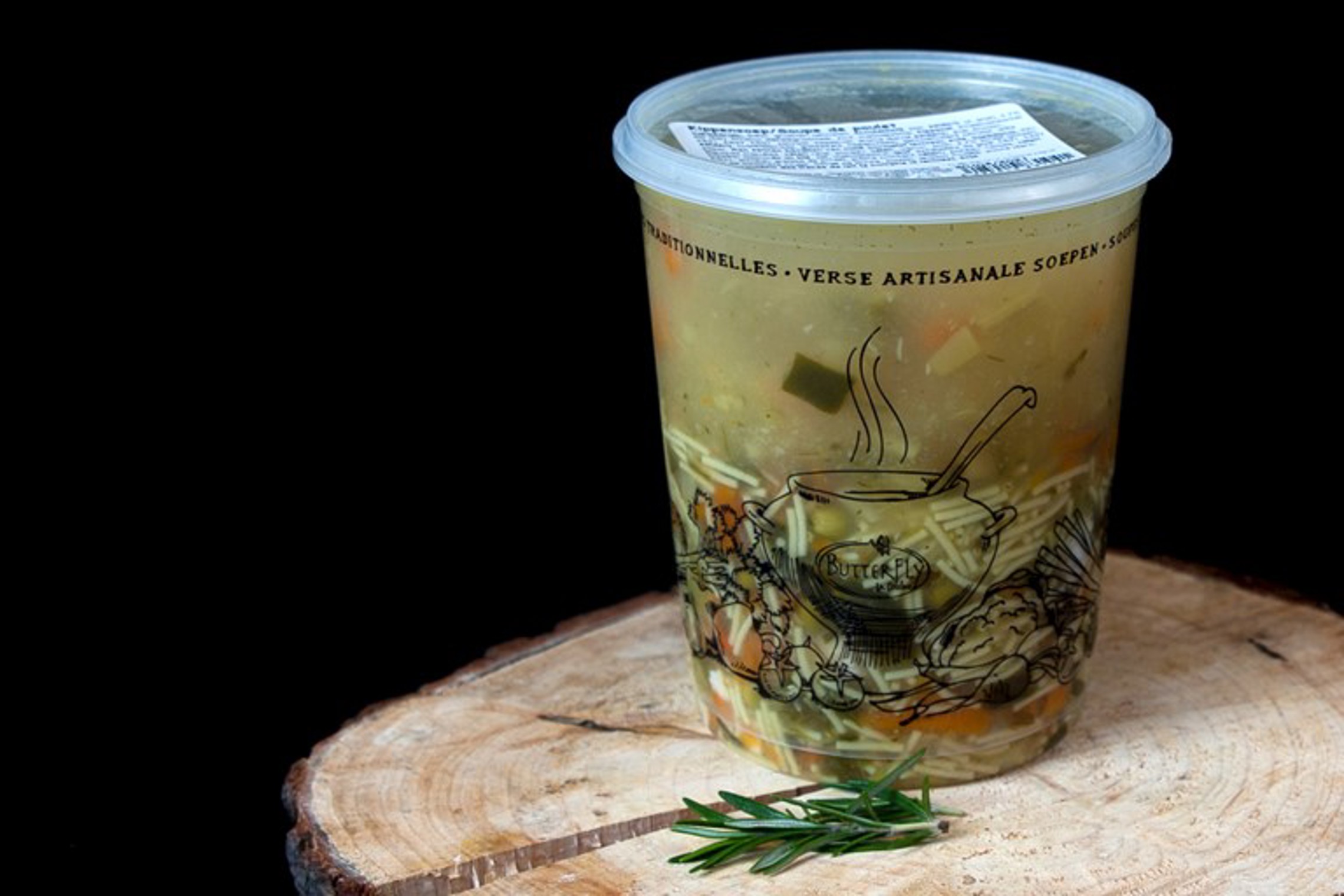 Benaming | Kippesoep met stukjes kip, verse kant en klare soep met typische smaak, geur en textuur |
