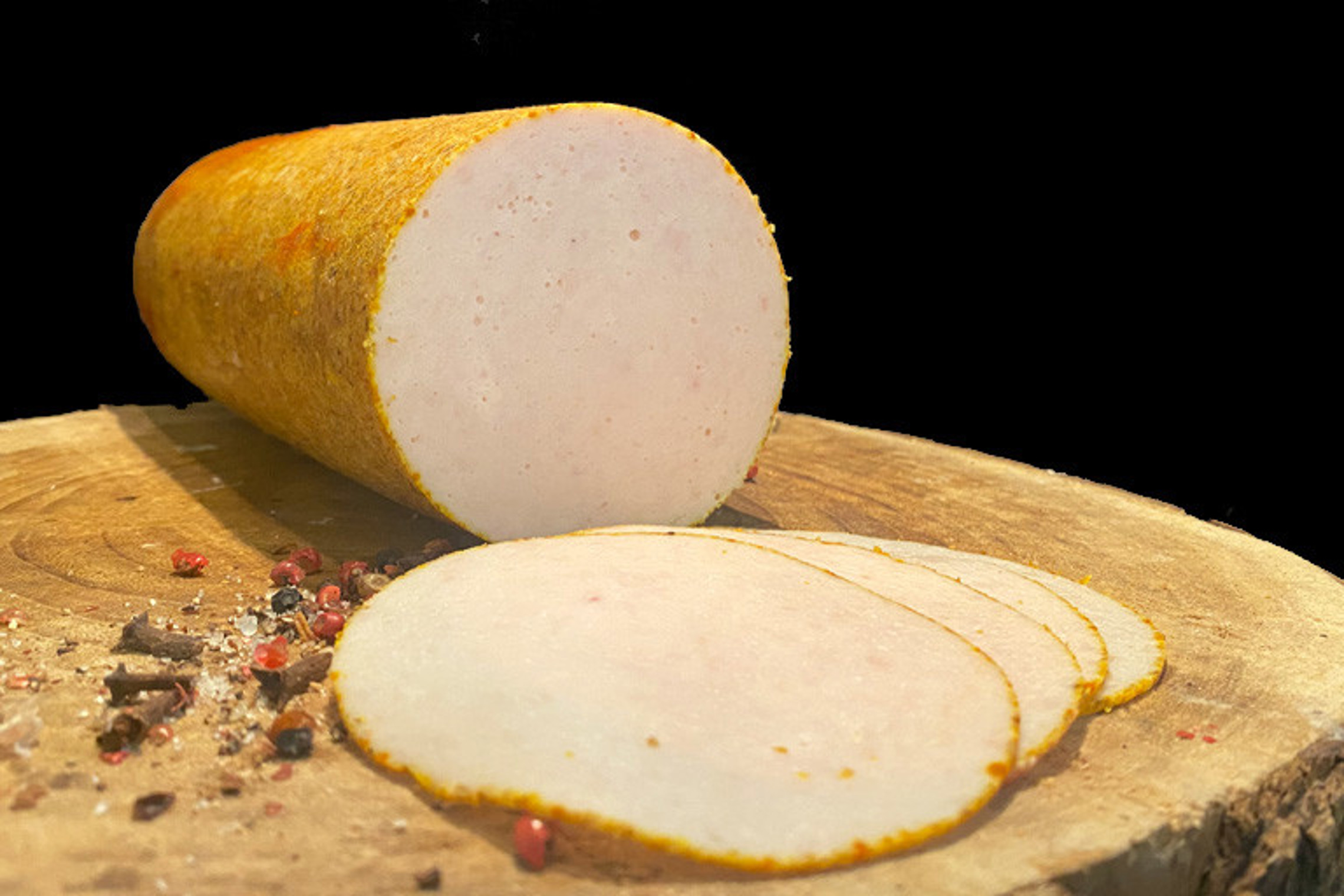 Huisbereid stukje charcuterie van puur kippenborstvlees, afgewerkt met een jasje van Madrascurry.