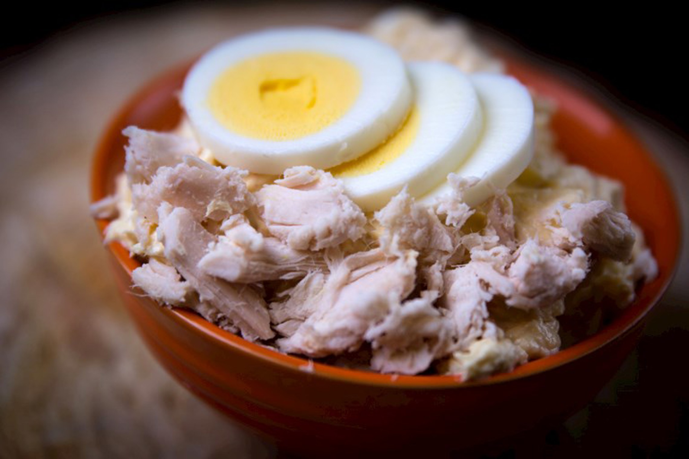 Lekker slaatje van gekookt kippenvlees, eitjes, mayonaise en kruiden.