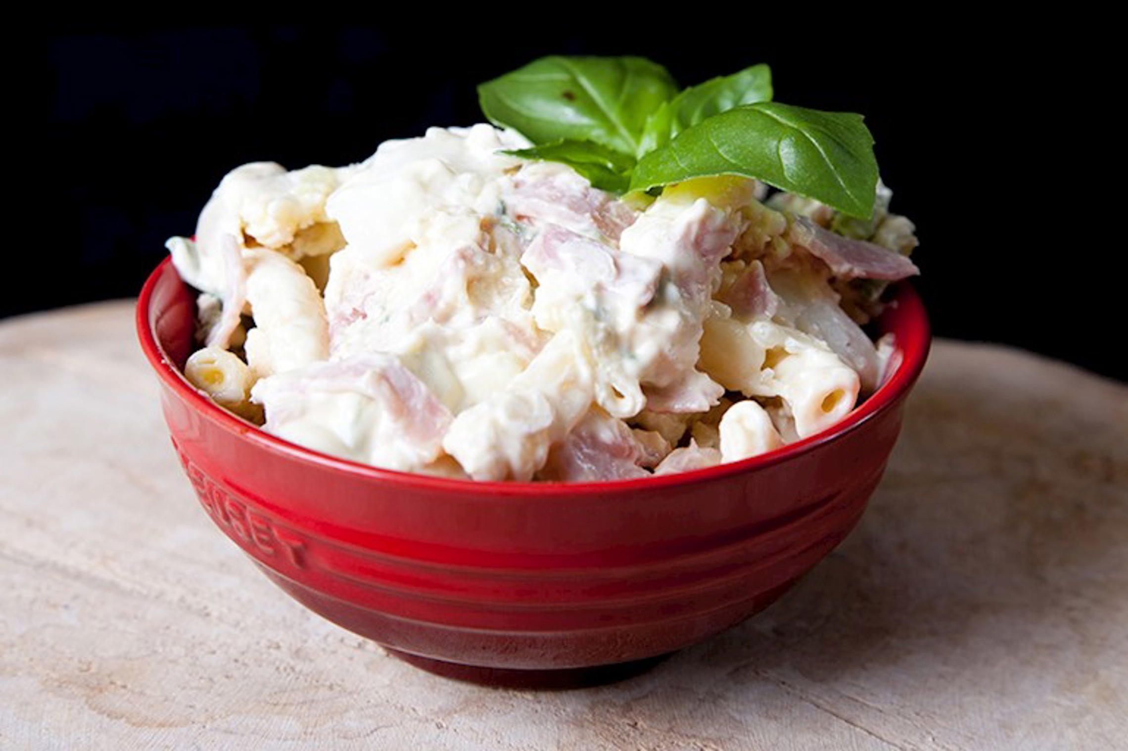 Koude pastasalade met eitjes, verse groentjes, hesp en een lekker sausje. Perfect als bijgerechtje voor de BBQ!