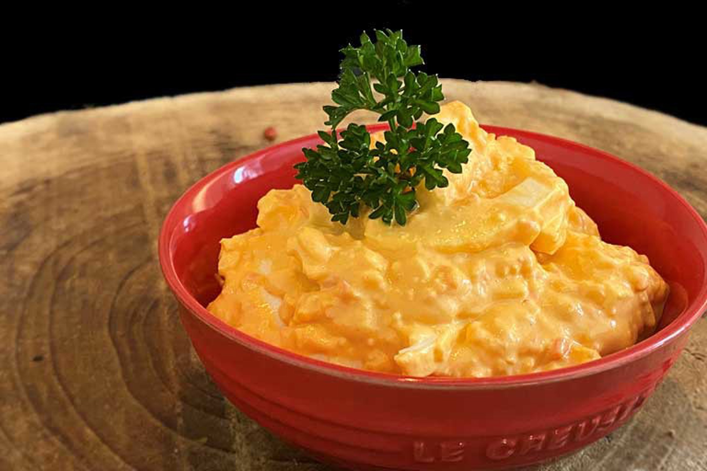 Een salade met pit! Originele huisbereide salade op basis van krab, mayonaise, eitjes en samourai.