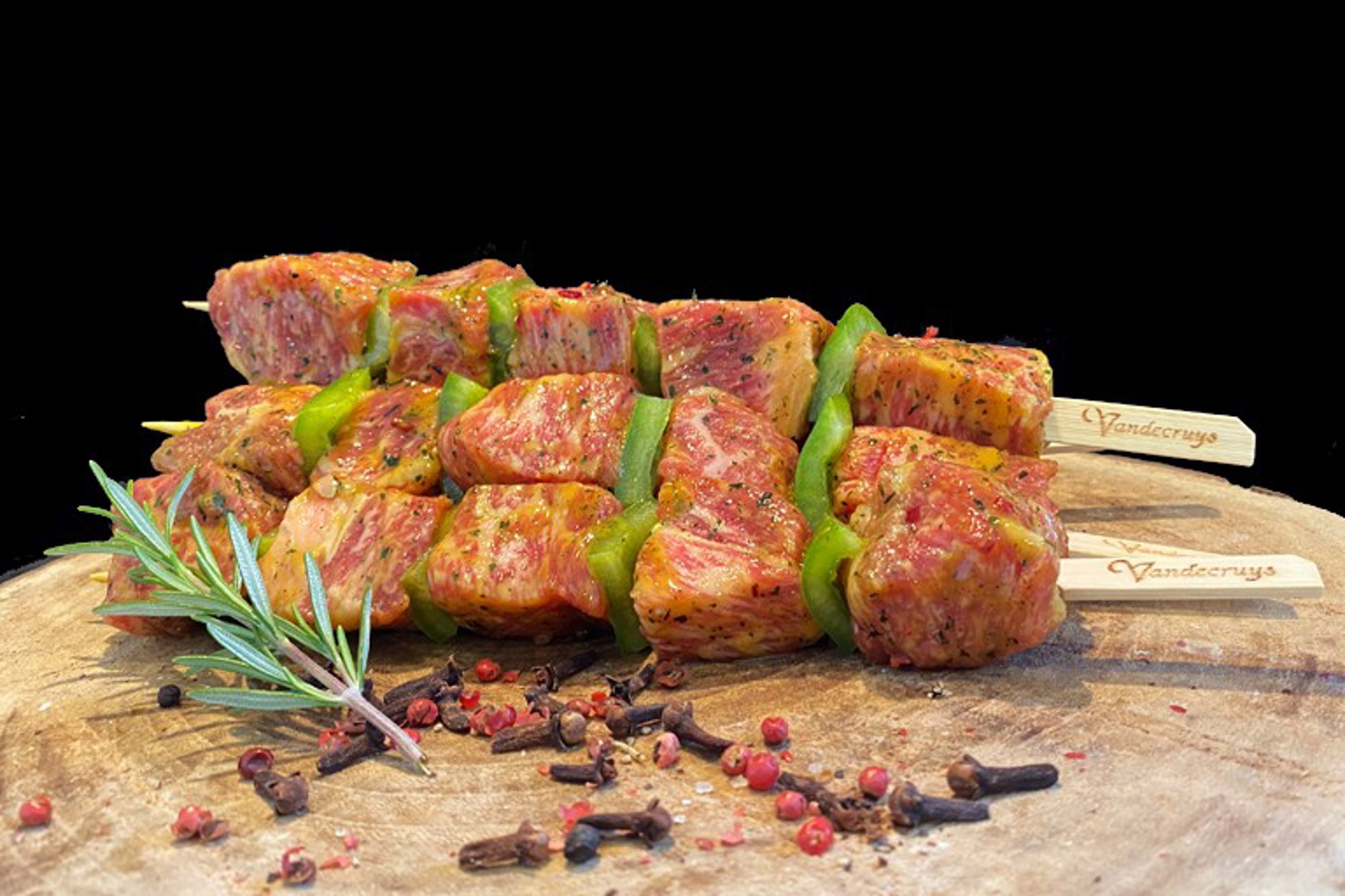 Topsaté van Wagyu-vlees. De gemarmerde structuur geeft het vlees een rijke en volle smaak. Bovendien zeer gezond door de onverzadigde vetten. Afgewerkt met een pittige marinade met curry met een zoete achtergrond.