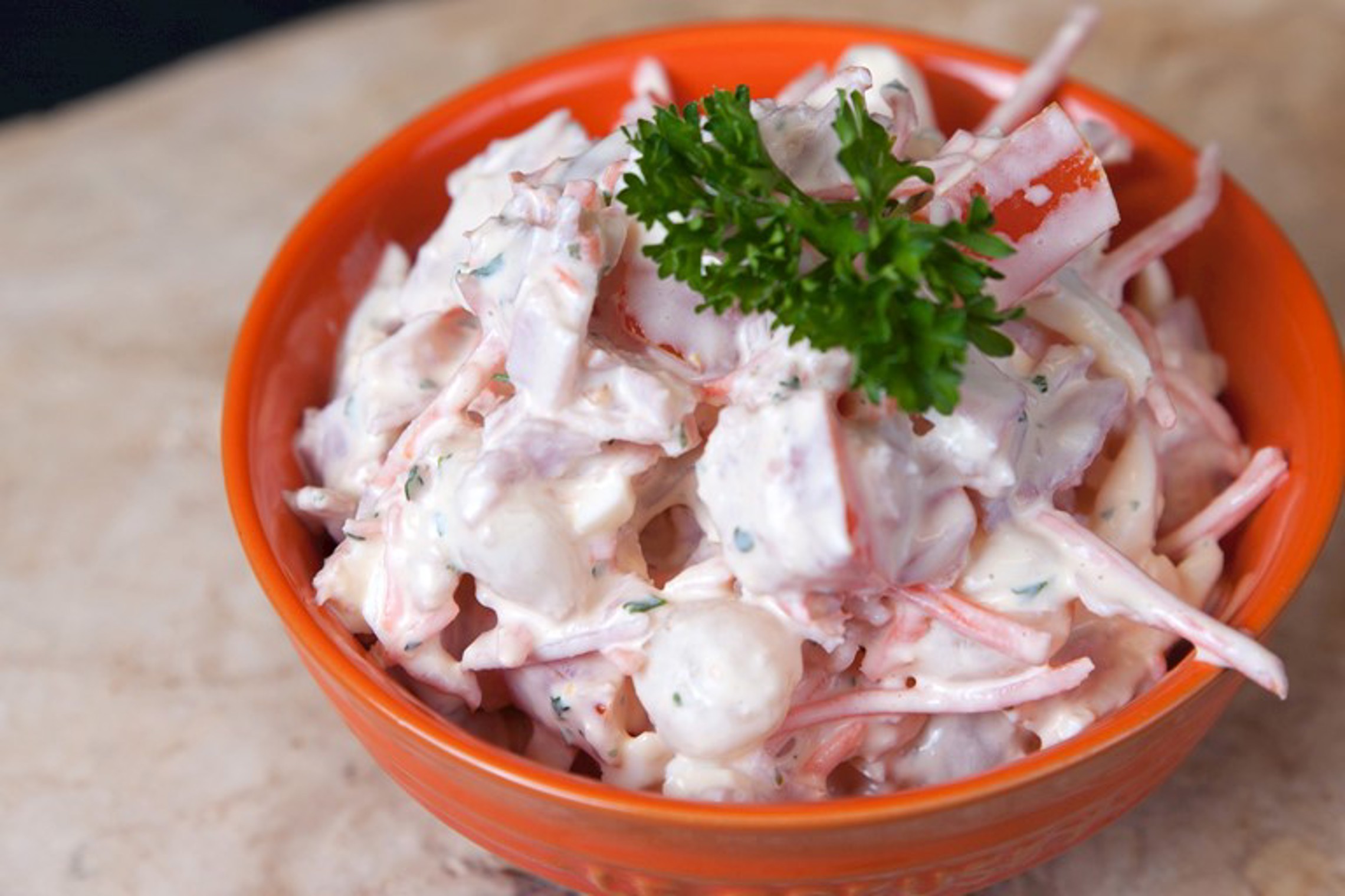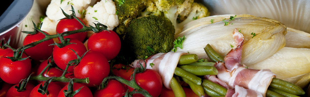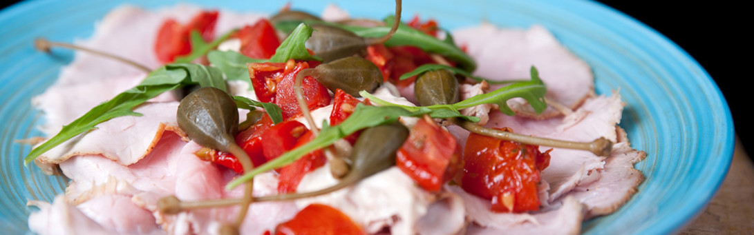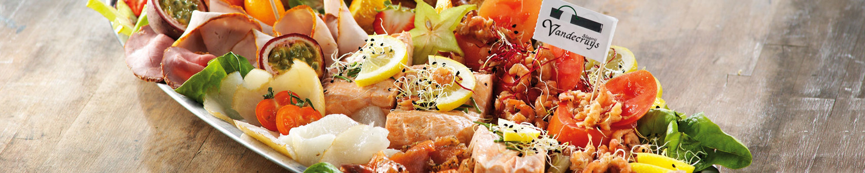 Héérlijke vleessalade gemaakt van ambachtelijke beenham, mayo, en eitjes, afgewerkt met tomaatjes, zilveruitjes, worteltjes en pijpajuin.