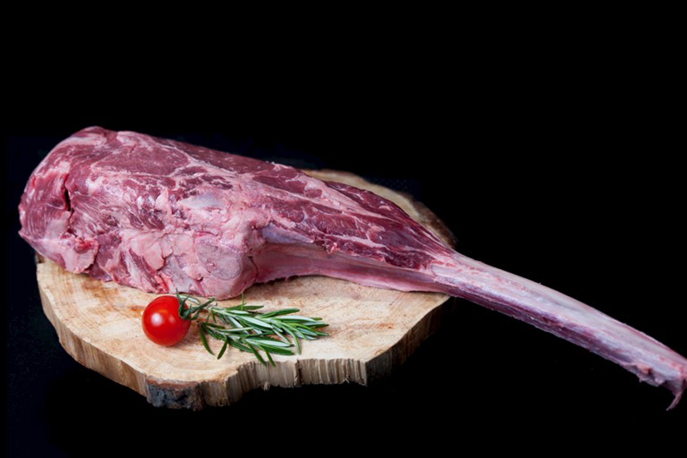 Één van de lekkerste en meest robuuste stukken vlees van het rund. Een steak met uitstraling! Een prachtige rib-eye met de volledige rib er nog aan. De Tomahawk heeft een grote hoeveelheid intermusculaire vet, waardoor het een erg smaakvolle steak is.