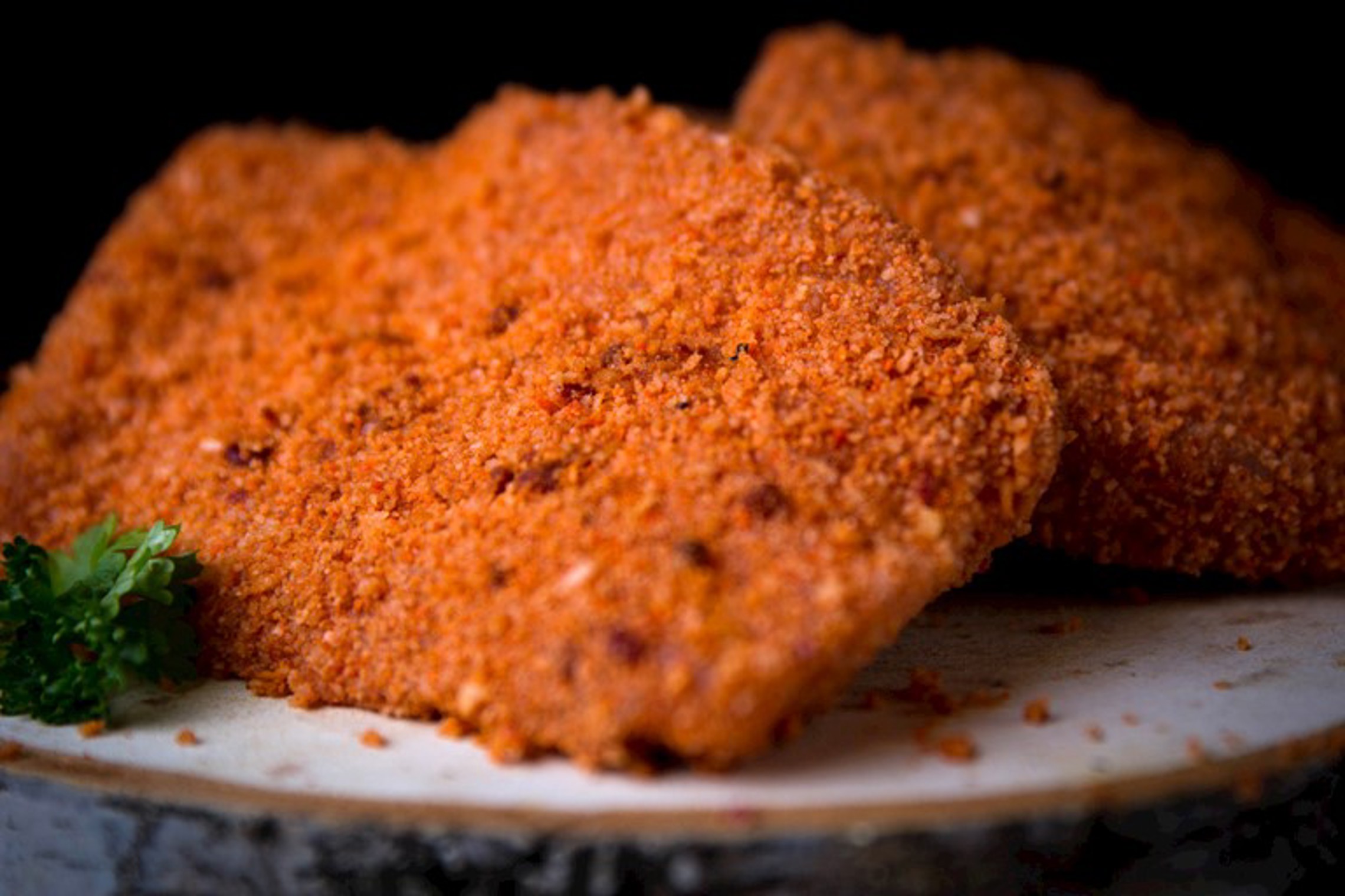 Een platte schnitzel van varkensvlees, voorzien van een krokante, oranje paneer met een lichte paprikakruiding. Makkelijk en snel te bereiden.